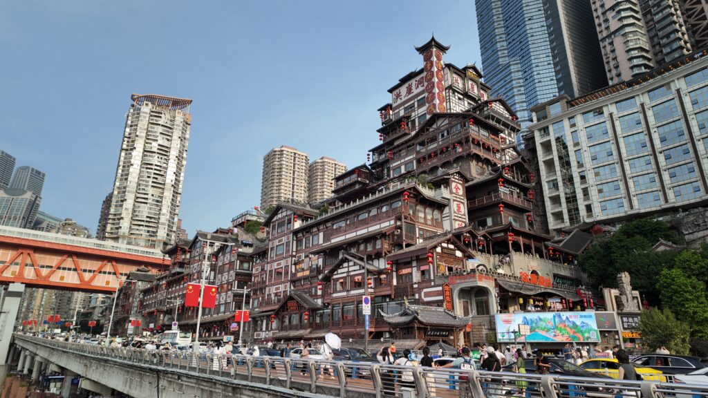Uno de los lugares más icónicos y que sí o sí hay que ver en Chongqing es Hongyadong. Se trata de un complejo formado por varios edificios tradicionales, construidos prácticamente en la ladera de un barranco y que a día de hoy acoge numerosas tiendas de souvenirs, puestos de comida y restaurantes.