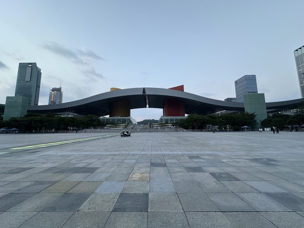Justo delante se abre una gran explanada que conecta con el eje central de la ciudad, rodeada de rascacielos y espacios abiertos que contrastan mucho con otras zonas más caóticas de Shenzhen. Es un lugar perfecto para pasear sin prisa, hacer fotos y disfrutar de ese ambiente tan futurista que define esta parte de la ciudad.